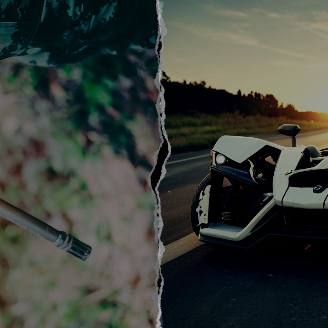 Gary unclasped his seatbelt and leaned forward, peering beyond their SUV's cracked windshield and dented hood. He could make out what appeared to be a white car, completely mangled at the front. It was not an ordinary car though. It had three wheels, reminiscent of that tricycle car he saw once in a commercial.