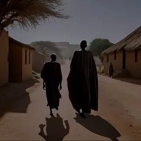 Her father was chattering away, cracking jokes, but his guests seemed disinterested. The first guest, closest to her father and sitting on the floor mat, was an old and ragged man. His clothes hung in tattered shreds, barely covering his emaciated frame. In the stale room, his oddly shaped bald head glistened with sweat and his leathery skin bore deep creases of age. The old man chewed a kola nut slowly, his sharp, sunken eyes darting around the room but never settling on her father. His fingers, gnarled and calloused, clutched the kola nut tightly as he nodded his head, but not at her father’s words.